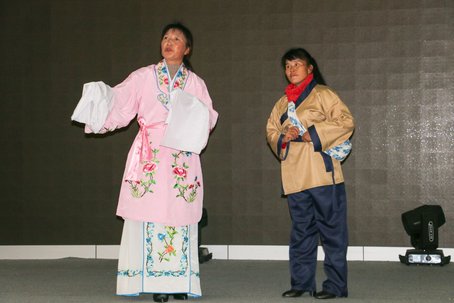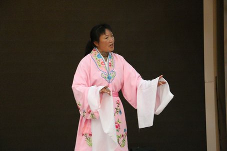 “小小鱼儿喂成龙,混在沙滩浅水中。日每盼望风雷动,怎奈时衰忆不同……”几句诗念罢,台下小勾锣、小钗伴奏“锵齐锵齐锵锵齐”响起,舞台上的王祖芳长袖一舞,小走几步,与廖美玲献上了一折感人的《安安送米》。