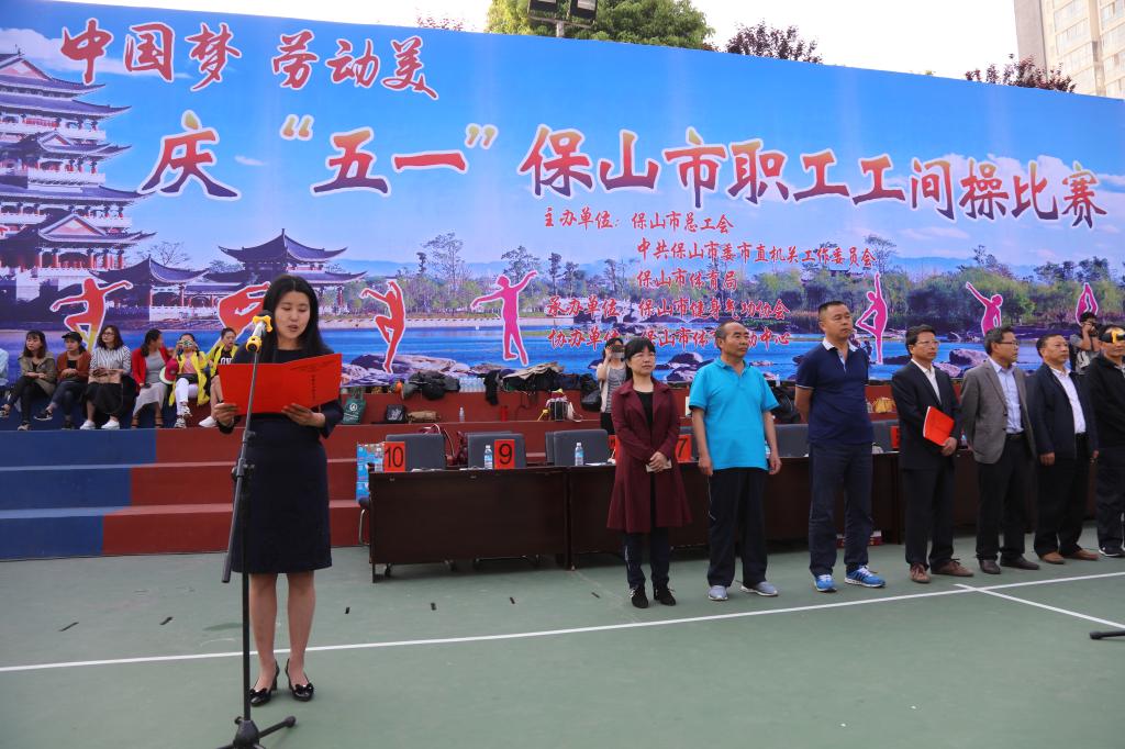 4月27日早上,由bet365官网注册、中共保山市委市直机关工作委员会、保山市体育局主办,保山市健身气功协会承办,保山市体育活动中心协办的“中国梦·劳动美”2018庆五一保山市职工工间操比赛在保山市体育场篮球场隆重举行。
