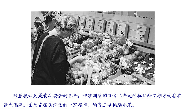 近年来,就连一向被人们称为是食品安全标杆的欧洲也出了问题。2013年,在欧洲多国超市中发现了以马肉冒充牛肉的“马肉丑闻”,波及国家多达16个。塞浦路斯、德国、英国、爱尔兰、波兰和法国的多家企业召回了数以百万计的“牛肉”汉堡。在欧盟国家,马肉的价格只是牛肉的1/3左右,有些供应商就以马肉充牛肉,来获得更高利润。